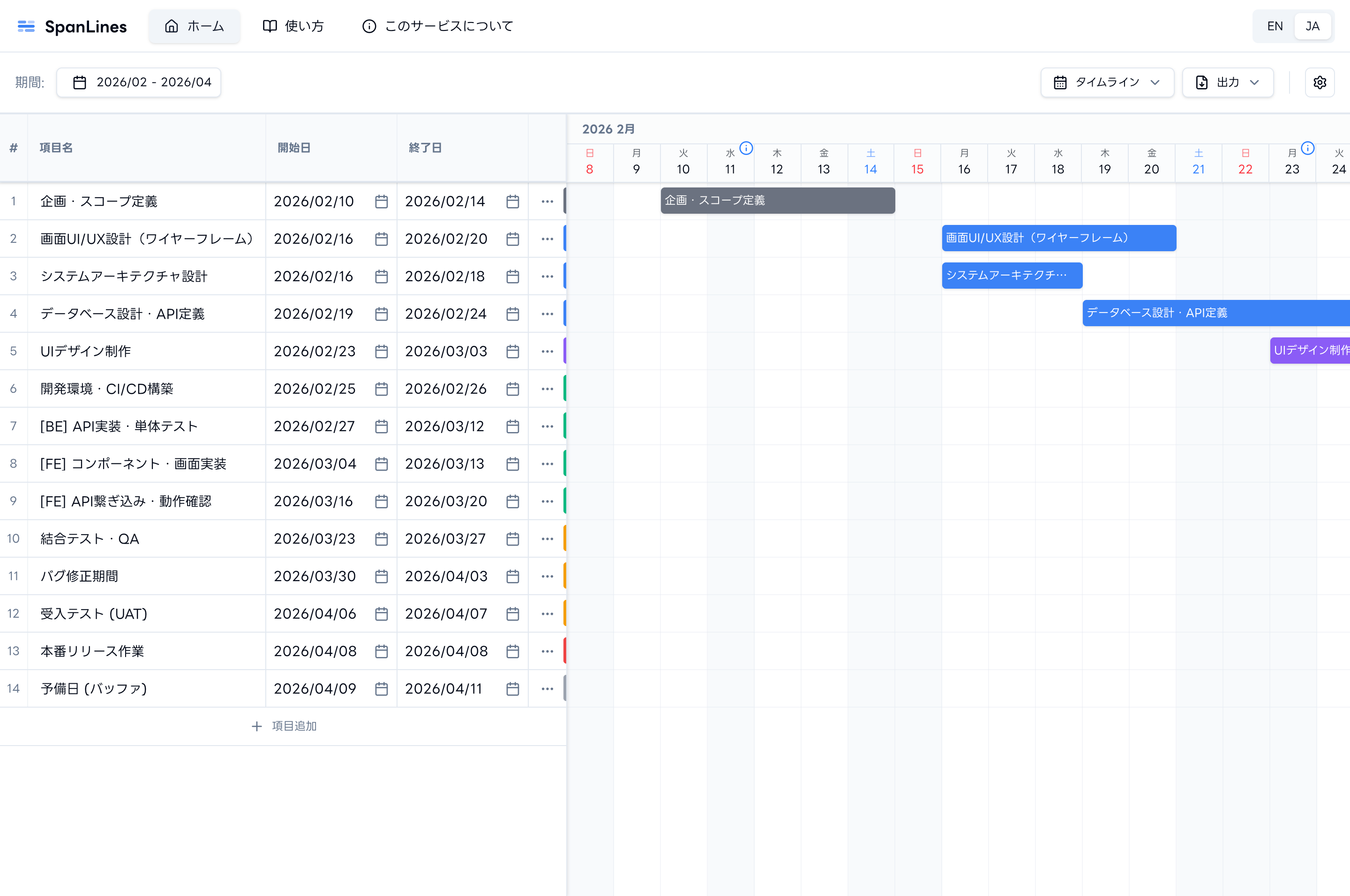 日付列を直接編集するか、タイムライン上のバーを左右にドラッグして、開始日・終了日を直感的に整えます。