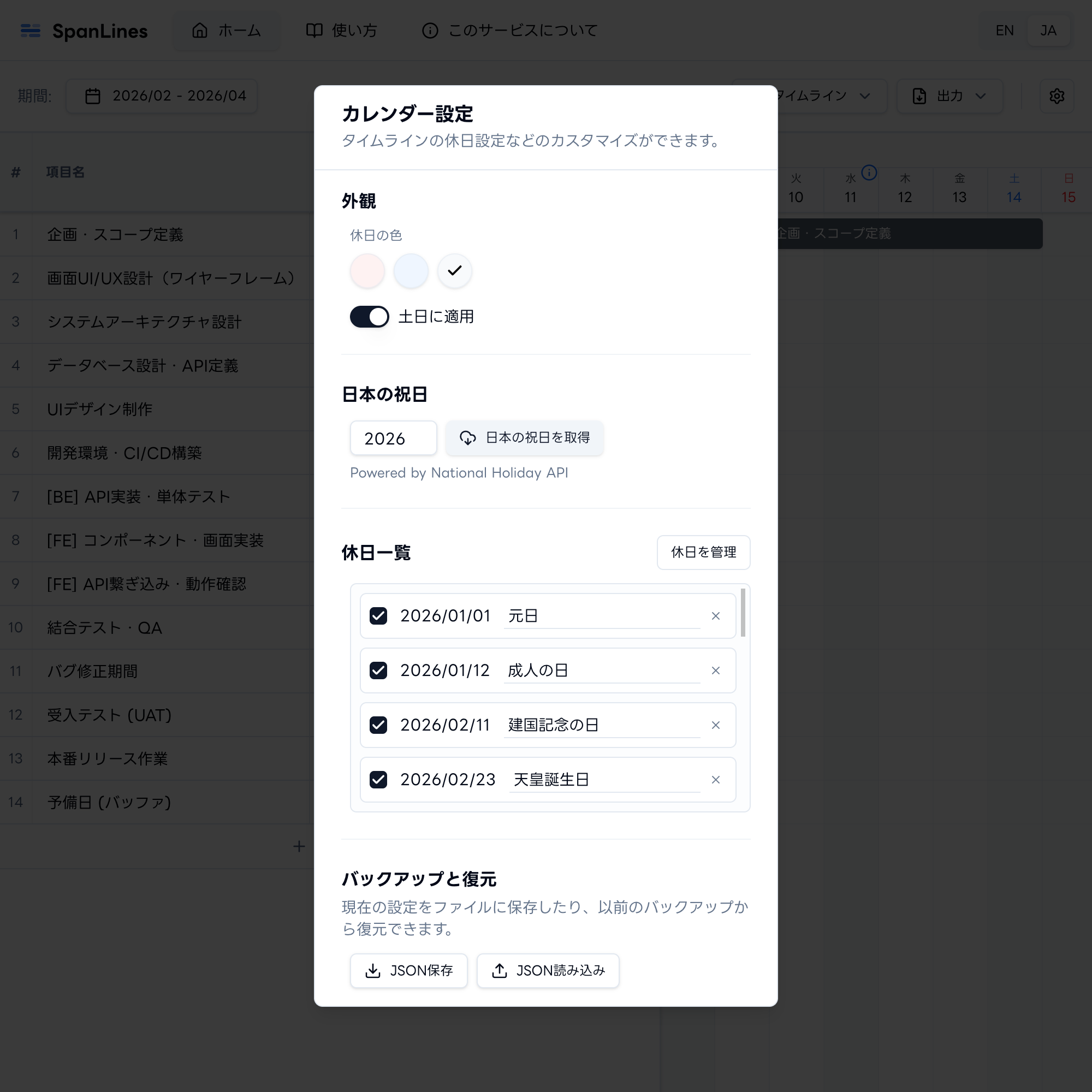 年を入力して「取得」ボタンを押すだけで、日本の祝日を自動でタイムラインに反映します。